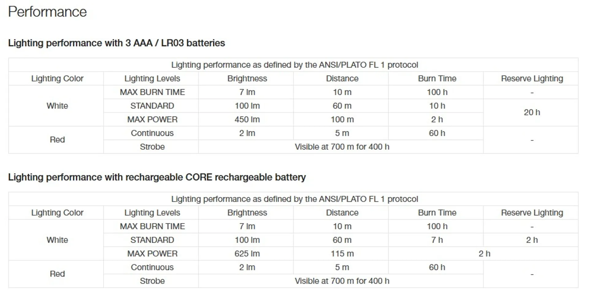 - Three white lighting levels: MAX BURN TIME, STANDARD (better power/burn time balance), and MAX POWER