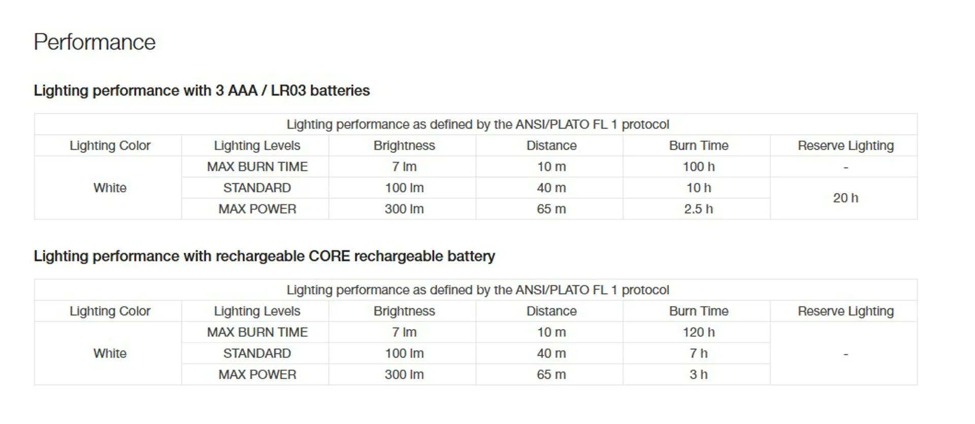 - Three white lighting levels: MAX BURN TIME, STANDARD (better power/burn time balance), and MAX POWER