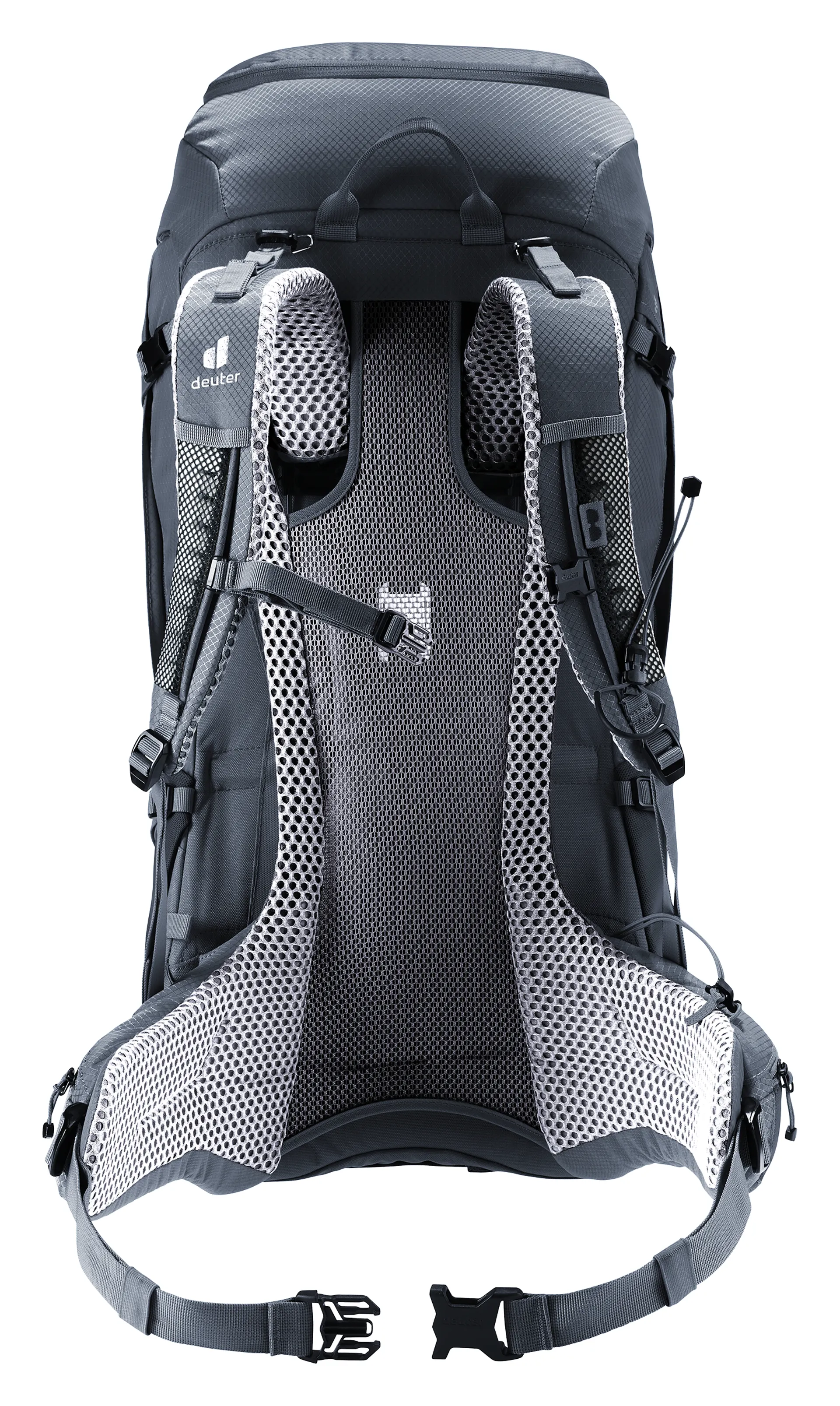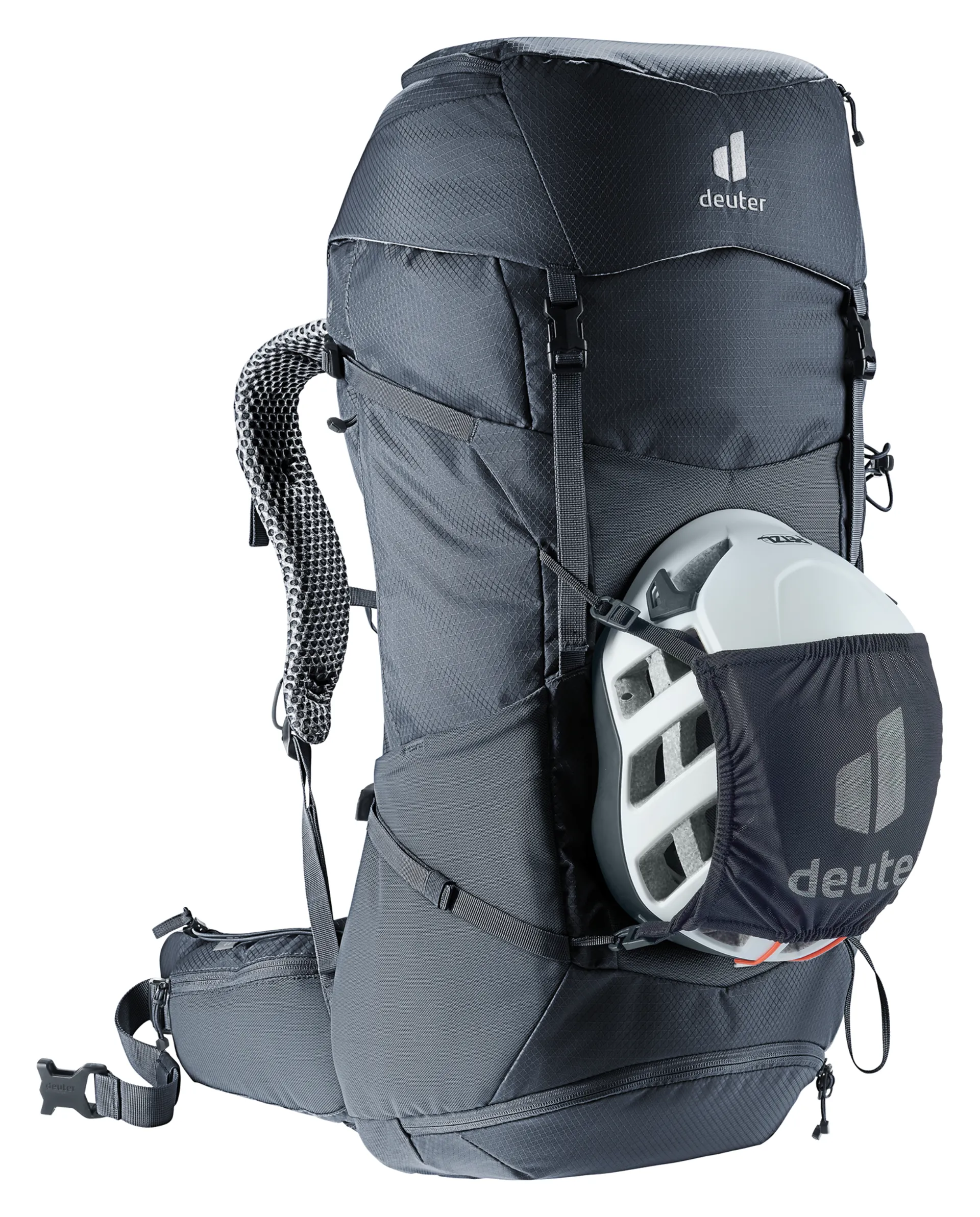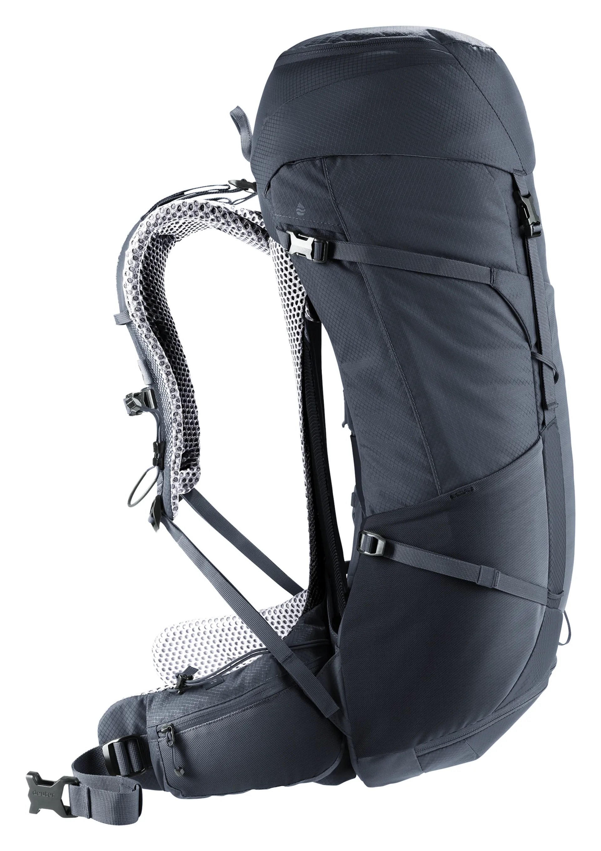 This hiking backpack for extended hikes comes with the Deuter Aircomfort back system featuring an innovative VariClick 5-stage adjustable back length. Shoulder straps anchored directly to the frame deliver improved load transfer, while the padded hip fins distribute the weight evenly. Soft mesh extends down the full length of the back for maximum ventilation performance and a wrapping fit.